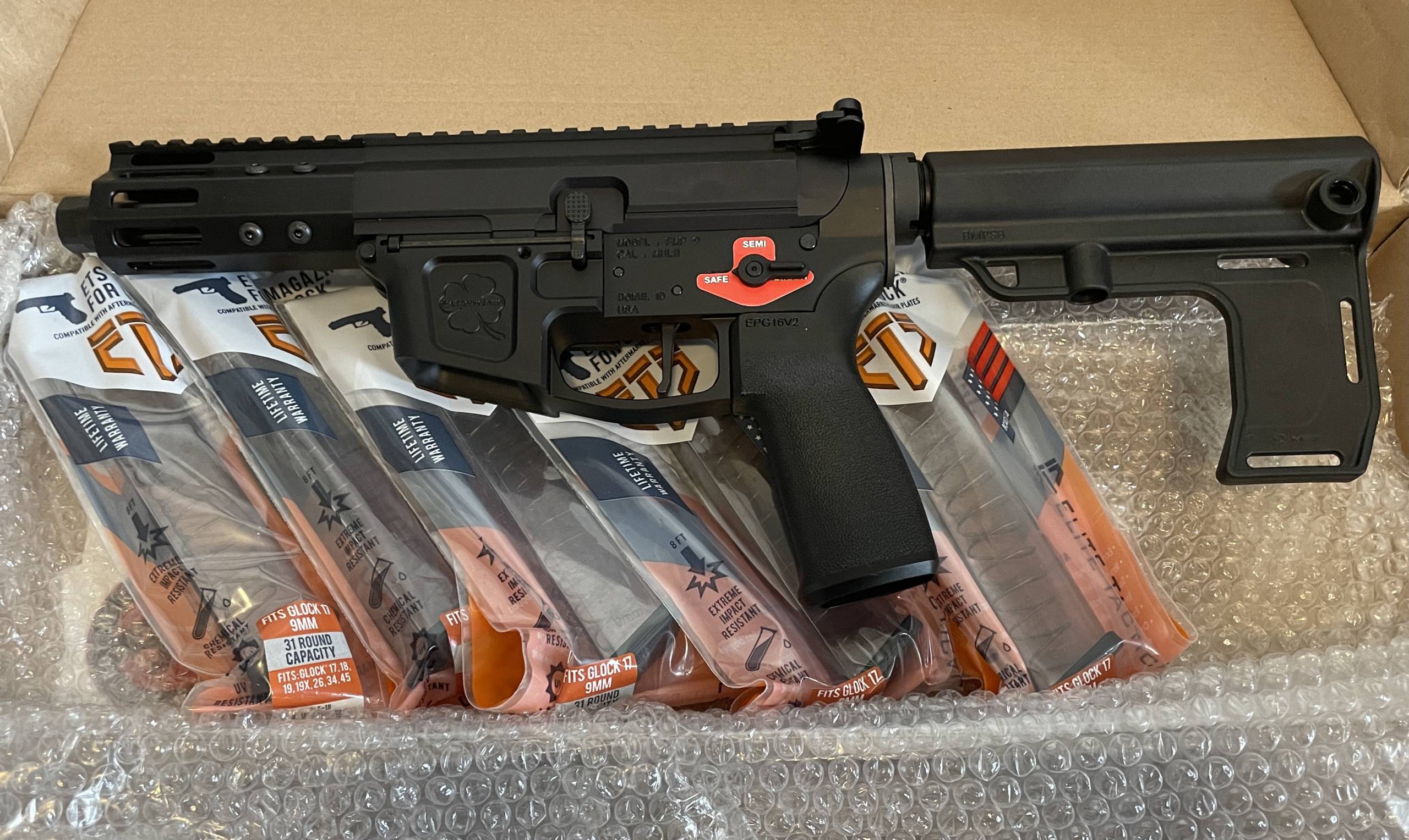 5″ FM9 Monolithic style upper receiver, with A2 charging handle, MFT FM9 Lower receiver, with MFT grip and brace. Mag NOT Included. Accepts Glock Mags!