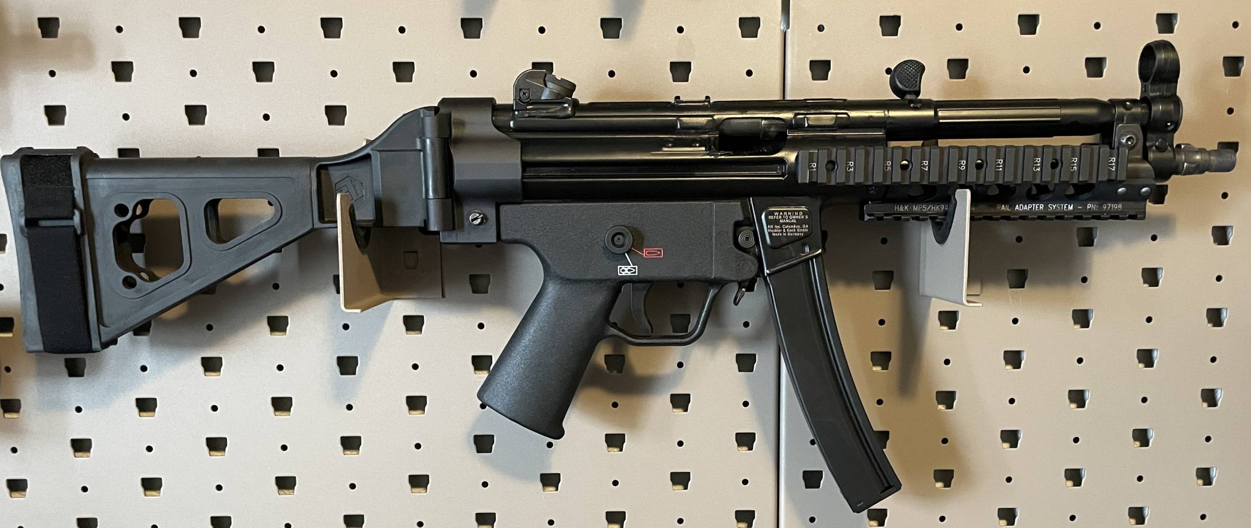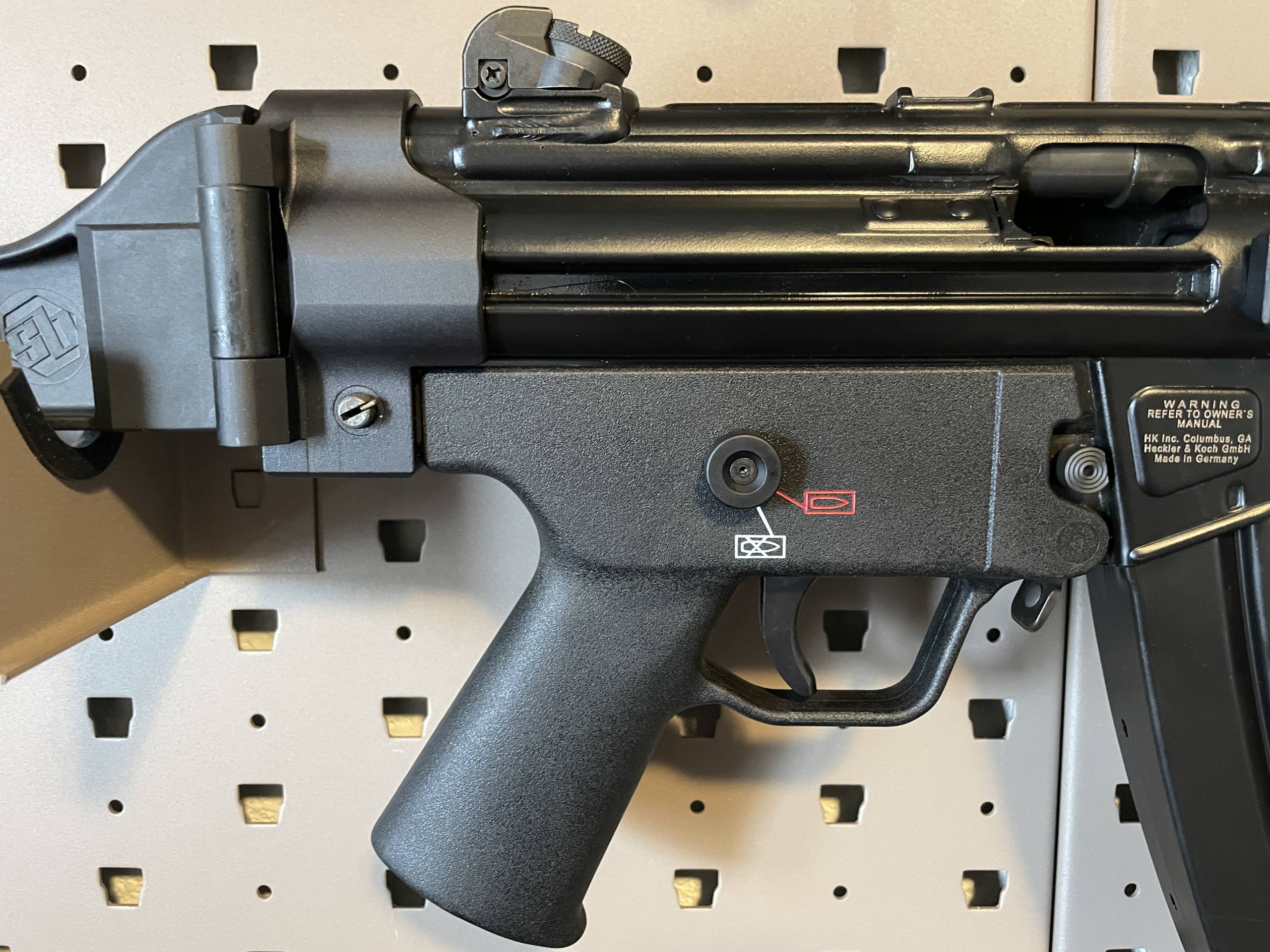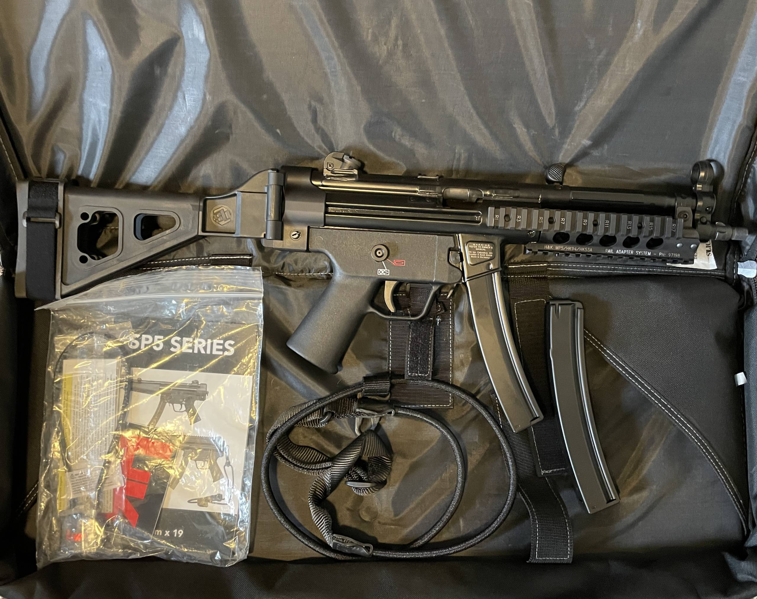 The H&K SP5 9mm Luger 8.86in Matte Black Modern Sporting Pistol is a semiautomatic, civilian-use firearm which was originally developed by Heckler & Koch as a sporting pistol to match the look and feel of the MP5 submachine gun. It retains many elements from the MP5, including precision-machined components and an overall attention to detail. The SP5 is equipped as a civilian pistol, with features like a Navy barrel with a threaded tri-lug adaptor, paddle magazine release, and a fluted chamber. The H&K SP5 9mm Luger 8.86in Matte Black Modern Sporting Pistol is built on a roller-delayed blowback operating system, which optimizes accuracy and creates a smooth shooting experience for the user. The H&K SP5 9mm also comes equipped with an elastic bungee sling, which stabilizes the weapon during firing and reduces user fatigue. The sling is easily installed, and can be simply snapped onto the swivel hardware on the receiver.
